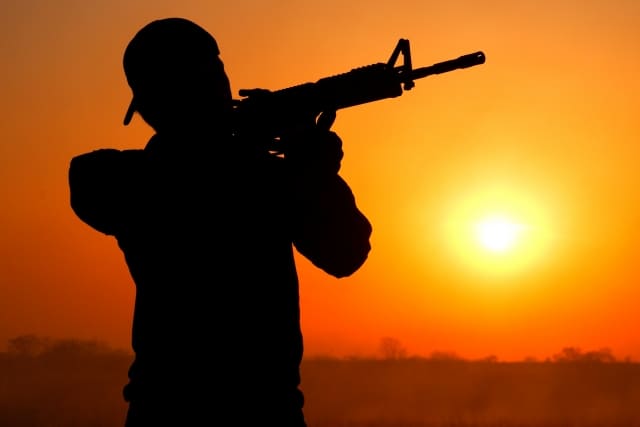 いっぽう、木の上からの狙撃は晴れた昼間で距離は数百メートルほどに見えますが、木の上では銃架を設置できません。そのため銃を身体で支える、いわゆる「無依託射撃」でした。